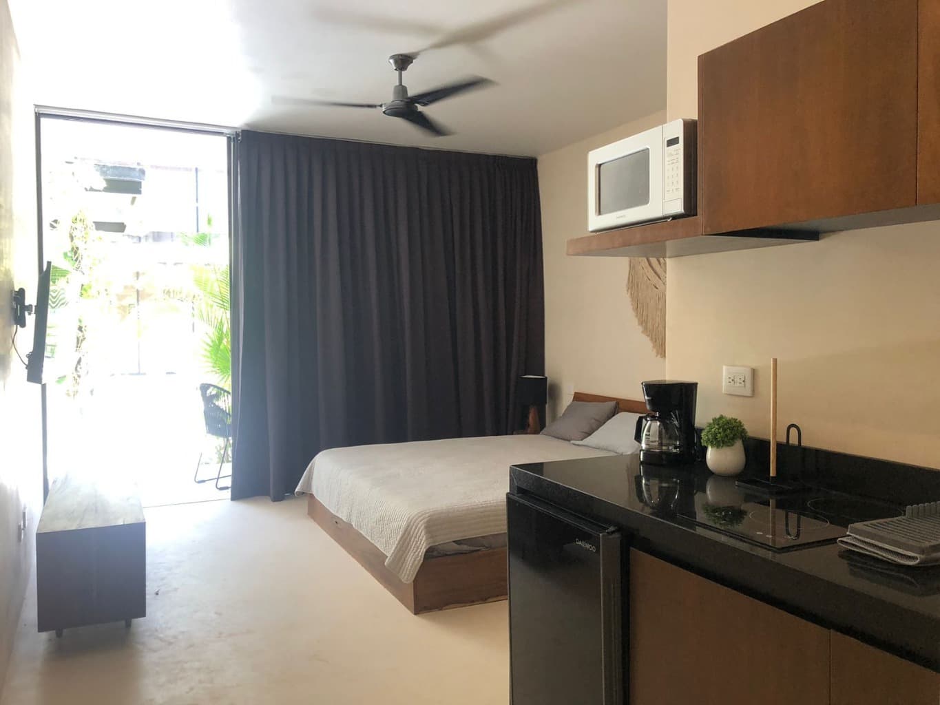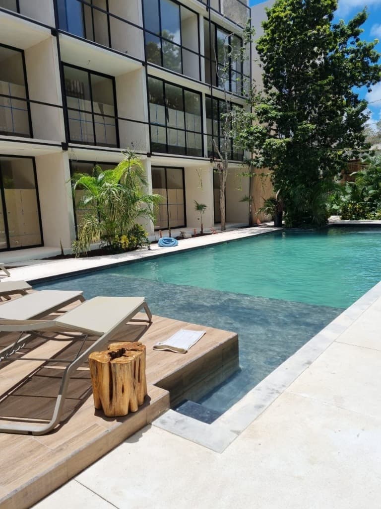 Distribución: Cocineta Recámara Walk-in closet Baño Terraza Características del inmueble: Superficie: 34.36 m2 Proyecto de 78 unidades habitacionales y 3 locales comerciales, distribuidos en 2 torres de 3 niveles cada una. Equipamiento estudio: • Incluye mantenimiento e internet • Totalmente amueblado y equipado • Baño completo con mobiliario con acabado tzalam natural • Calentador eléctrico • Cubiertas de cocina con acabado de granito color negro San Gabriel • Cancelerías de aluminio color negro • Minisplit Benelux tipo inverter • Puertas exteriores de madera de estructura de tambor con acabado tzalam natural • Terrazas con pisos en acabado de chukum con resina color natural • Ventilador de techo Equipamiento edificio: • Área de servicio – concierge • Gimnasio • Alberca • Chapoteaderos • Área para bicicletas • Lavandería (con máquinas de lavado y secado) • Solarium • Área lounge • Baños de Vapor • Acabados en muros de chukum color natural artesanal • Acabados en pisos de cemento blanco pulido con una mezcla de marmolina Estatus del Inmueble: Nuevo Desocupado Formas de pago: Transferencia bancaria Servicios de la zona: Agua Luz Cerca de Bodega Aurrerá Fraccionamiento con acceso restringido Entorno: Habitacional Información PROFECO: Contrato de Adhesión de prestación de servicios de intermediación para la compraventa de inmueble destinado a casa habitación. Registrado ante la Procuraduría General del Consumidor (PROFECO) Número 5976/2023 de fecha 20 de junio de 2023.