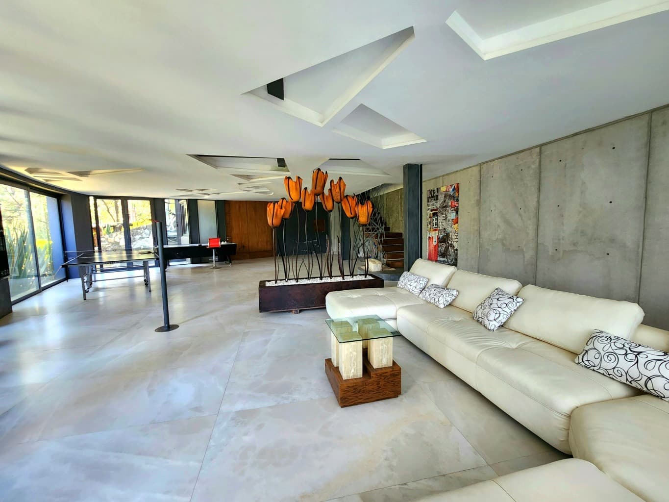 La casa está ubicada en el Fraccionamiento Vistas del Lago lote 29 y 34 en la localidad de Avandaro en Valle de Bravo Estado de México. El predio tiene una superficie de 2594 m2, es de forma irregular, con 3 frentes ya que es cabecera de manzana y tiene como vía principal de llegada la Av. Ruta de lago. • Planta Baja Se compone por un amplio vestíbulo a doble altura, sala interior, sala exterior, comedor, cocina con 2 alacenas, 2 amplias recamaras con baño y terraza, área de asador, alberca con bar, asoleadero y jacuzzi, closet de blancos, cuarto de servicio con baño, cuarto de escoltas, lavandería y patio de tendido, estacionamiento para 6 automóviles, amplios jardines con un lago artificial, área de baloncesto y 3 perreras. • Planta Alta. En este nivel se ubican cuatro recamaras con baño y 3 terrazas, incluida la principal que además cuenta con vestidor, jacuzzi y vista al lago.